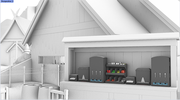 ![]() Early rendering (counter serve restaurant) concept model of a theme park attraction. In development, Modeled in Rhino, no imported assets. |
