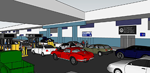 ![]() Early rendering (interior pre-show/queue) concept model of a theme park attraction. In development, Modeled in Rhino, no imported assets. |