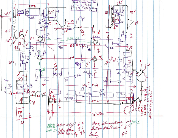 There are two ways to measure more than one space and I've done both. Place each room on a separate piece of paper. This doesn't get cluttered and there is more room for dimensions, notes, and details, but it can get confusing when you get back to the office and start shuffling pages and trying to match doors from different sheets. When possible, I try to get as much as I can on as few sheets as possible. Besides, construction will waste enough trees when the set is changed.