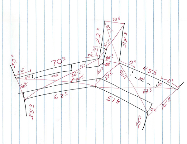 So you have 15 minutes during a tech scout and no help. First, sketch the room in simple lines which shouldn't take longer than 30 seconds, showing approximate corners and openings. This doesn't have to be perfect, hopefully the numbers will make it work out. I take an overall measurement in three directions - don't forget the ceiling height. I stand in each corner and photograph the opposite corner. If the room is long and narrow, I'll stand at each end and shoot the length as well. If this is all I get, I can come reasonably close and it's good enough for a simple Director Drawing. I take more photos if I have time. Next, I measure all around the perimeter of the space. Don't bother with moldings, just measure the rough door and window openings and corners. Unless you are matching the location or building plugs or walls, the moldings don't usually mater. Don't forget to measure the height of the window sills and heads. You don't need these for a Director Drawing, but Set Decorating might aks for window sizes for window covers. To measure a round column, use a seamstress tape or string to wrap around the column and divide the circumference by pie (3.14) to extract the diameter. Don't get so wrapped up measuring the perimeter that you forget to locate columns and other objects toward the center. Show the door swings, you might fill this in with photos if you forget, but it's better to remember. Add cabinets, counters and other similar constructions. If you need the profile of a molding, that is why you brought your profile copier and studio molding catalog. Press the profile copier against the surface and carefully trace the edge on a piece of paper. When a room has corners that are not square, you can fold paper into the corners and be sure to label them. Or use a sliding-T bevel gauge. It's nice to have help, but I usually don't. After a short time you will