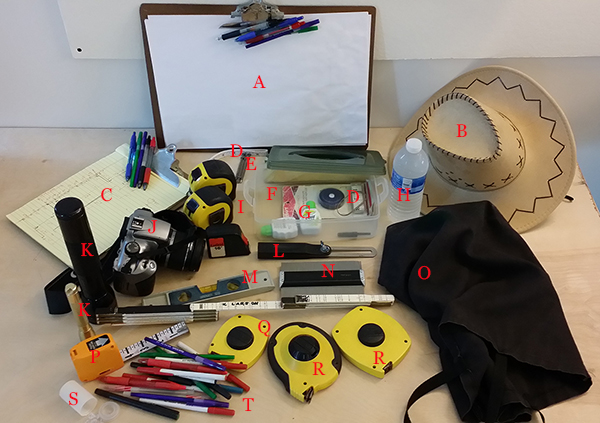 A) 11x17 clipboard; B) Hat for exterior surveying on hot days; C) 8 1/2x11 clipboard; D) Seamstress tape measure; E) 16d double head nails; F) Box for small parts; G) Correction fluid in case you have time to use it; H) Water for drinking in the field and to use to find level; I) Collection of tape measures; J) Camera; K) Flash light; L) Sliding-T bevel gauge; M) Level; N) Profile comb; O) Carrying bag; P) Keson Pocket-Rod; Q) 50 foot tape; R) 100 foot tape; S) Push-pins; T) Collection of pens. There are other tools, laser measure, measuring wheels, protractor, and others, but this is what I use. I also carry an umbrella for sudden rain storms, it's hard to write on wet paper.