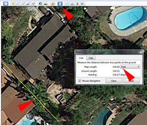 Because I want the drawing to be to scale, I use the ruler tool to draw a line of known length along one edge. Click the ruler icon on the top tool bar to open a dialog box. Click once at one corner, move your cursor and watch the distance displayed and click again at an adjacent corner. I include the resulting yellow line in my saved image and I include the distance as part of the file name (ie. Joes_House500feet).