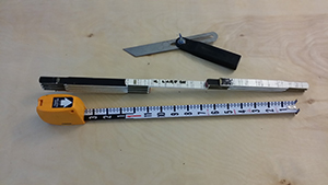 Top to bottom: sliding-'T' bevel gauge, folding ruler with alternating black/white (each color is 6 inches), Keson Pocket-Rod (the rod comes completely out if needed).