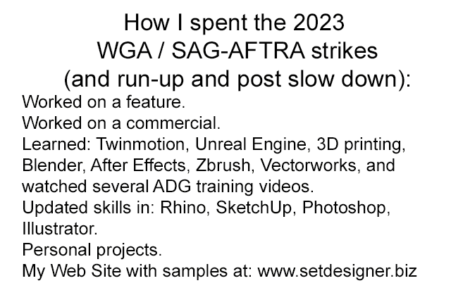 It is my belief that Set Designers have four primary responsibilities: 2D Construction drawings, location surveys and as-builts, Director Drawings, and models. I have been drafting since traditional drafting in junior high and am often complimented for the speed and quality of my Construction drawings. I have been using AutoCAD since 1991 and feels it's more efficient to make 2D Construction drawings with a 2D drafting program, rather than make a 3D computer model and try to extract 2D information from that. I am fast at location surveys and have written articles for ADG publications on the subject. Some Set Designers refuse to do surveys, but I prefer to work from his own trusted surveys. Director Drawings are quick when starting with a correctly drawn AutoCAD drawing with all objects on the correct layer. Shading and other esthetics can be added if required and time allows. A bird's-eye view can be made from 3D work, but isn't usually required. My career in the Entertainment Industry began as a Visual Effect Model Maker. I have built physical industrial, architectural, display, and Theme Park models. I was one of the first Set Designers to use 3D computer models, making many good models in AutoCAD and in some programs that no longer exist. Today, I work with Rhino, Sketchup, and a little with Blender, Vectorworks, and Unreal Engine. I can make renderings using several of these, plus Twinmotion, but that can lead to a conflict with the Illustrators. I have a general understanding of several Adobe products and uses them to supplement my Set Design and presentation. I worked many years as a Prop Builder, primarily in miniatures, Prop Shop, electronics, Mill work, and Special Effects and am one of only a few Set Designers who has actual experience building scenery, which adds greater understanding when creating Construction drawings. In Television, I usually work on one hour dramas and am open to other venues. I have helped launch many new successful series. For many years, I've worked at what is now called Conceptual Modeling. When using the computer, I primarily work in AutoCAD (2D and 3D), SketchUp, and Photoshop, and use others when necessary. I am currently learning Rhino, Twinmotion, Unreal Engine, Vectorworks, and Blender. My computer kit includes most popular drafting, modeling, and graphics programs including AutoCAD, Adobe Creative Suite (Photoshop, Illustrator, Acrobat, and others), VectorWorks, SketchUp Pro, Rhino, and others. All software is licensed, I try to keep everything current. I started on big shows, however, when the big shows left for Atlanta, I stayed home doing great work on smaller shows. I would like to get back to the big shows while I am still interested in doing great work on smaller shows. Several people for whom I have repeatedly worked have retired and I needs new crews with whom I can work. It's hard to soar with eagles when you aren't invited into the flock. Bio... |